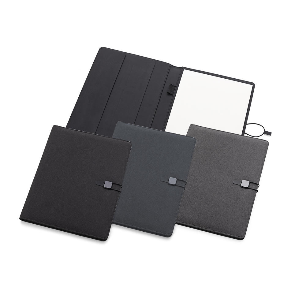 Pasta executiva com capa almofadada em tecido poliéster, ideal para reuniões, eventos e treinamentos. Conta com bloco de anotações de 20 folhas, compartimentos internos para canetas, cartões e documentos, além de amplo espaço para personalização com logotipo ou arte da sua marca.